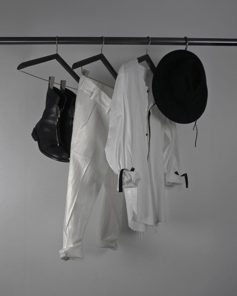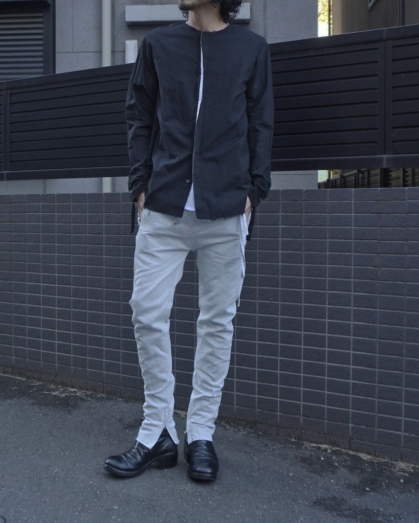 次はモード軸を保ちながらの夏コーデ。白線がさらに効果的。