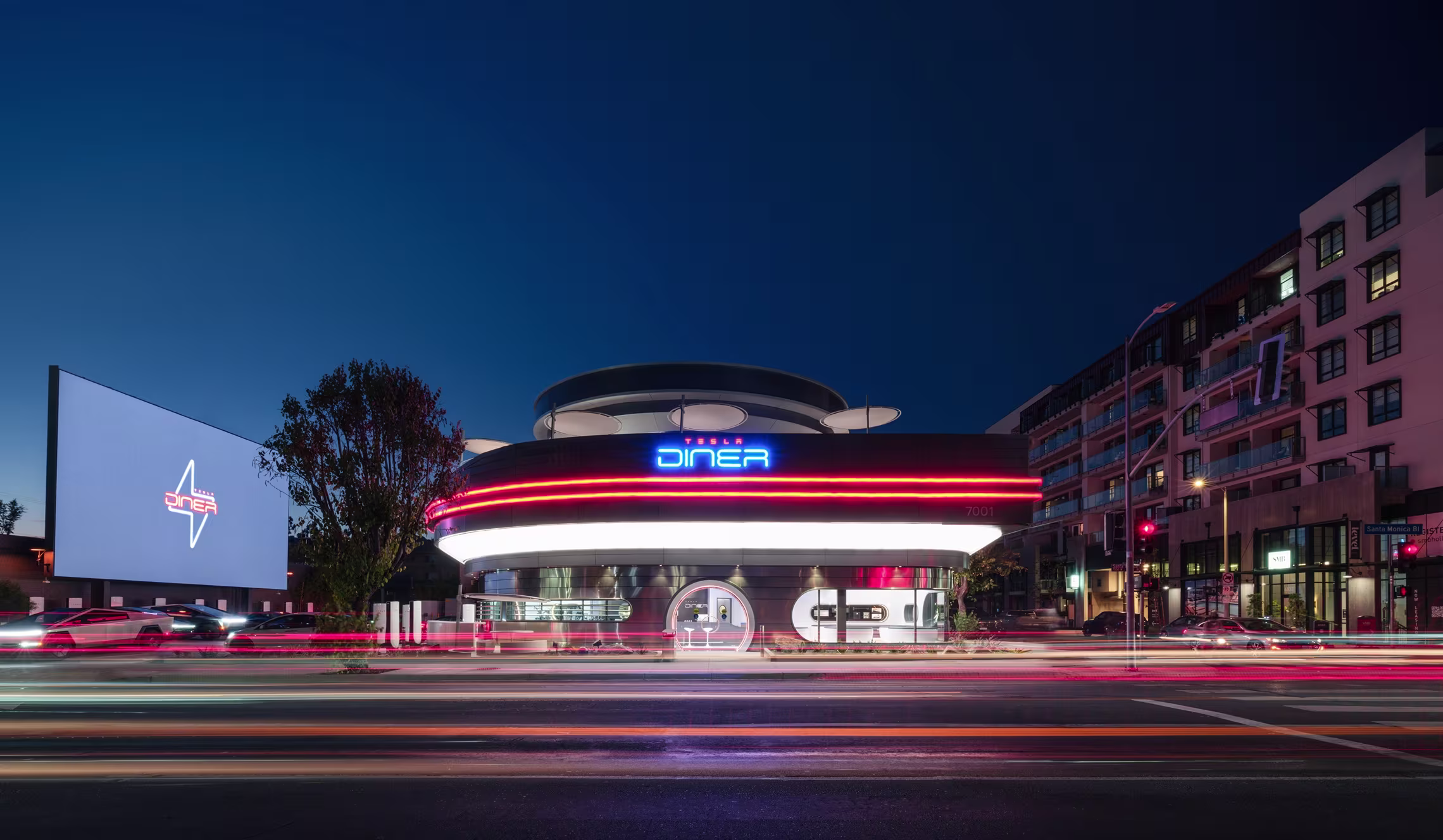 TESLAがやっている24時間営業のダイナー「TESLA DINER」ってのがあって、住宅街みたいなエリアにズドーンと異物があります。