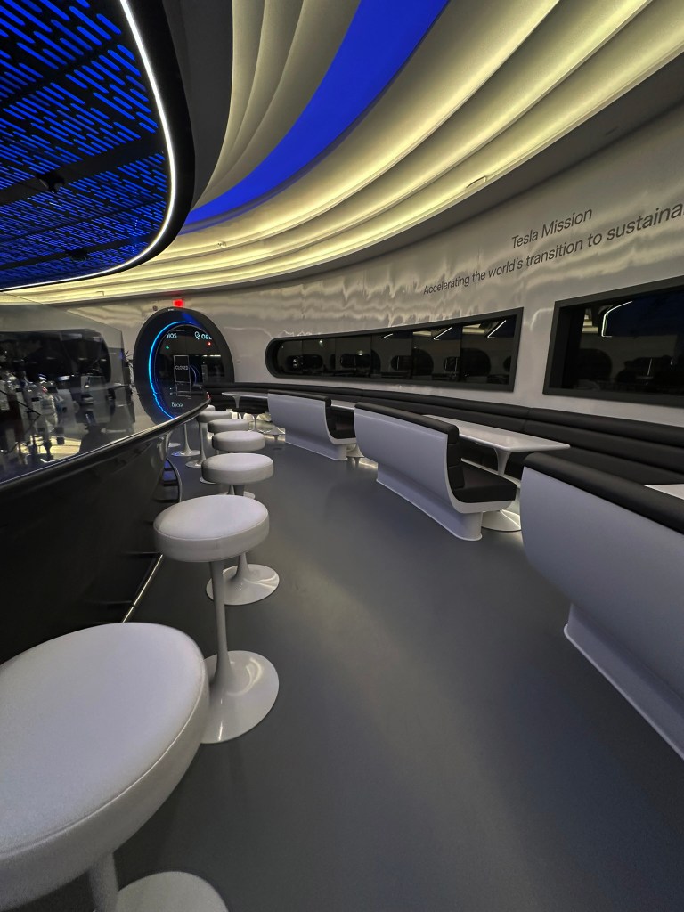 そこでは軽めの飯、グッズ、TESLA車用の充電器が無数に並んでて馬鹿でかいスクリーンが2つ。内装めちゃSF。ってかそこだけもう未来。観光客はそんないません。