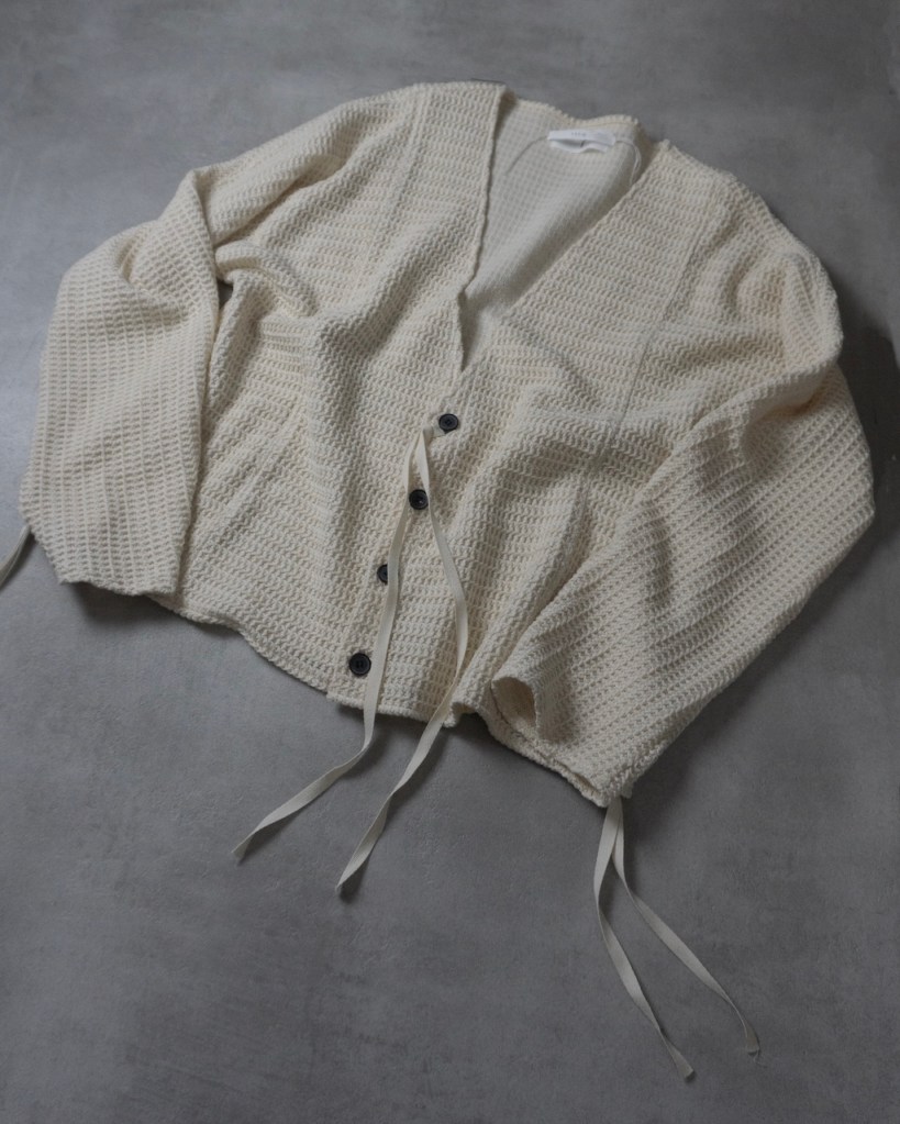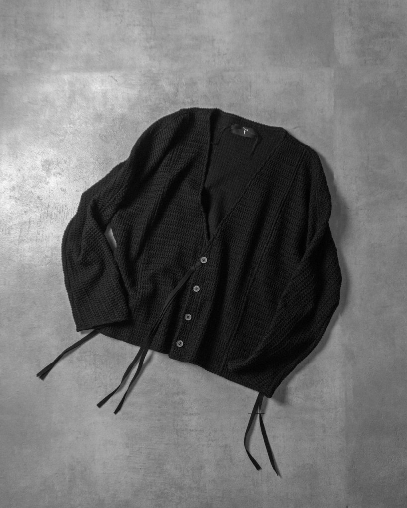 カーディガンの温和な要素を覆すフロントの深いVライン。 ニットが持つ特有の柔和さとVが描く鋭利なエッジ。この相反する緩急のコントラストこそが作品としての完成度を決定付けてくれました。