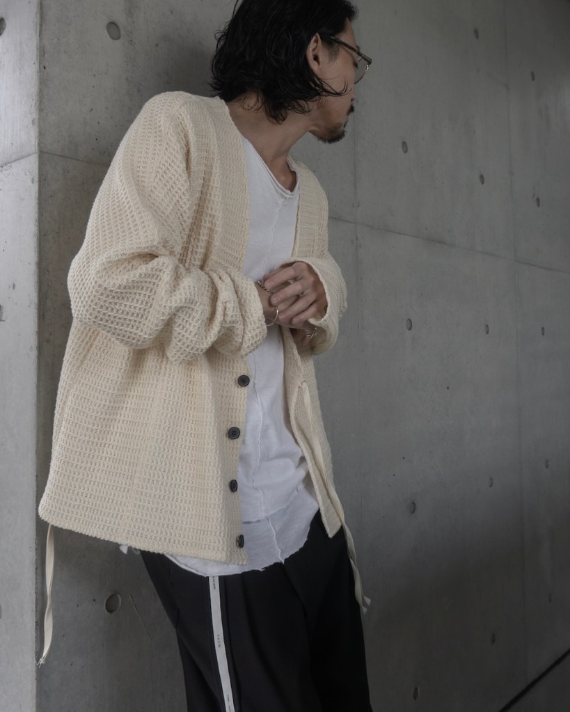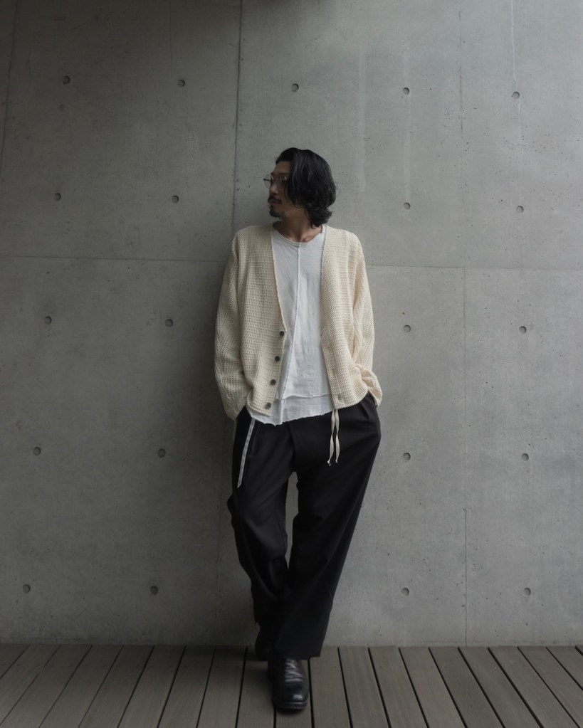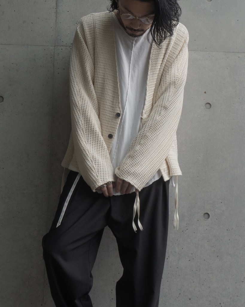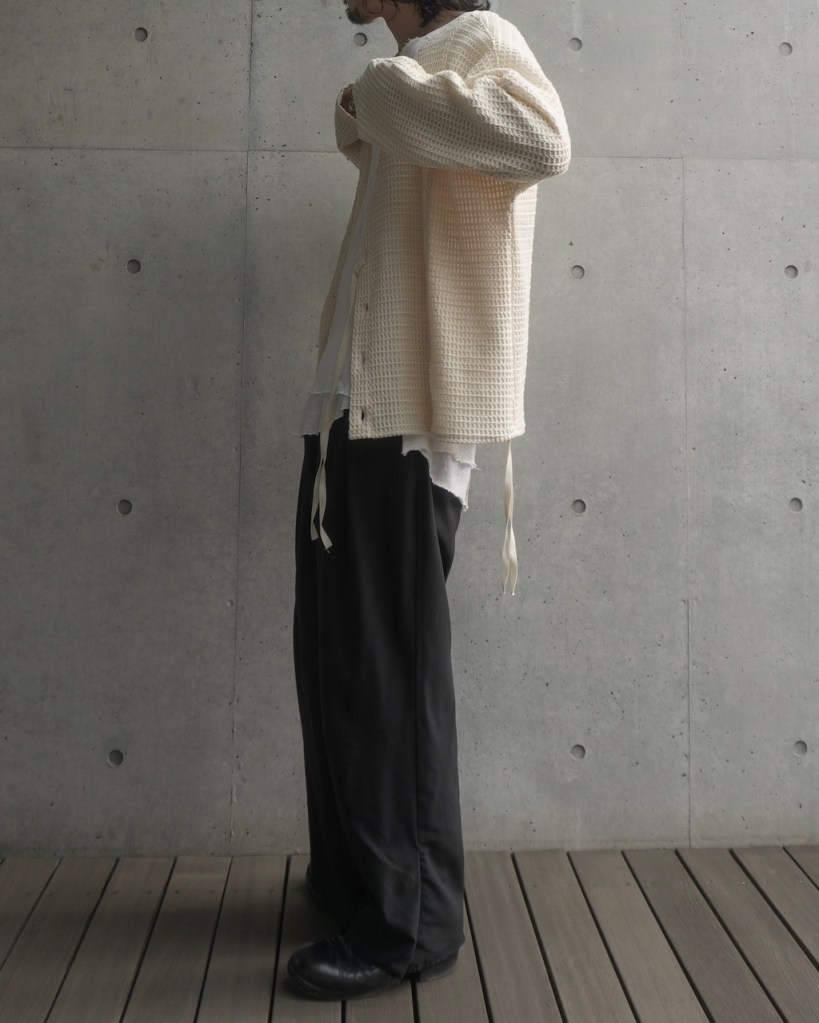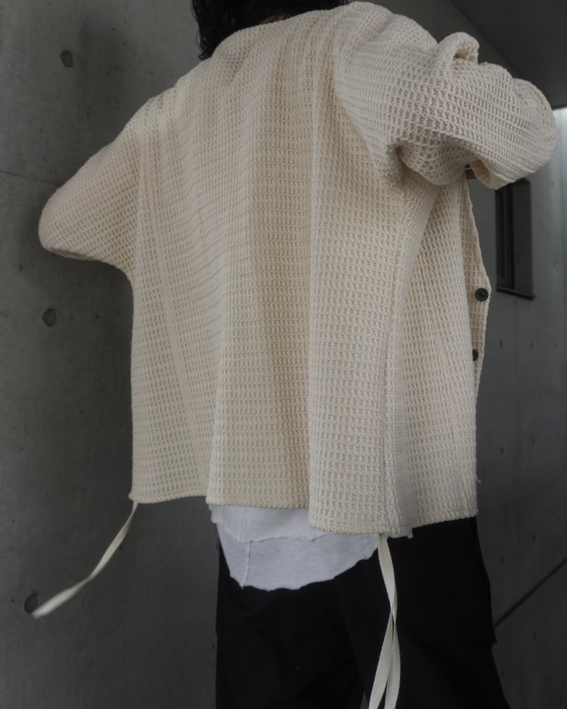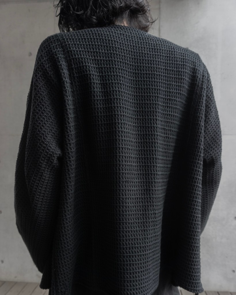 ドロップショルダーではなく、身体のラインを自然に馴染ませる設計。直近では24awのDORMAN CARDIGANの”あの”遺伝子を受け継いでおります。