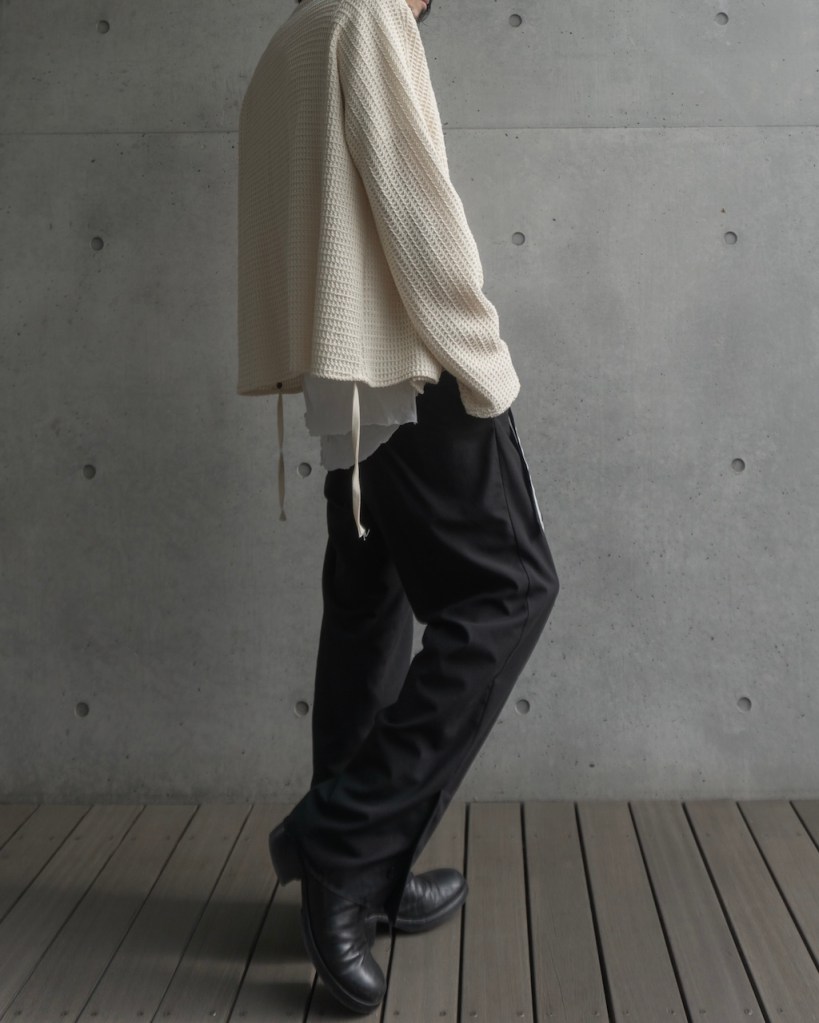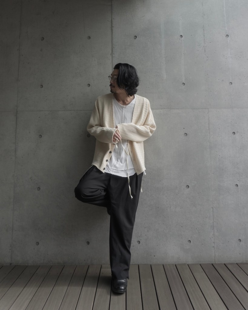 ひとえにニット・布帛といえど本当に多種多様であり、糸の太さ、光沢、編み方でも印象が大きく分かれます。肌触りに特化したもの、目地が綺麗なもの、正直そういったものはいくらでもあります。しかし今必要なものは、それを凌駕するような時代性をもつもの。目指すべきは数年後にその人独自の味が宿っている可能性。