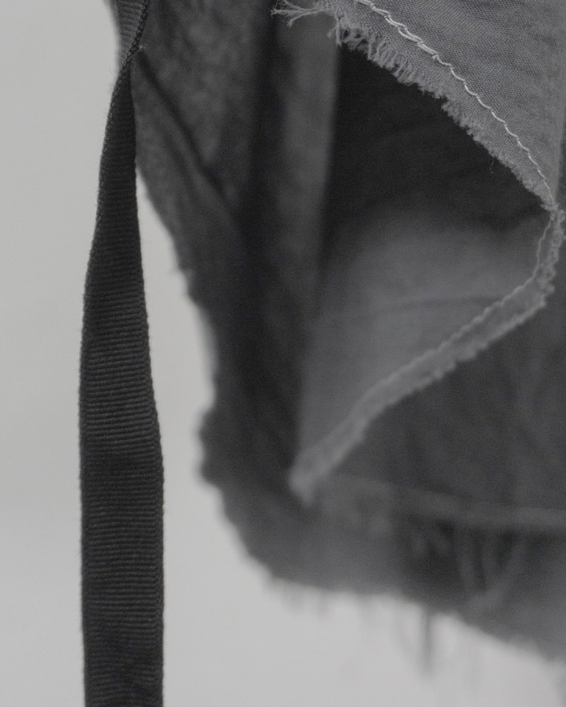 不均等で無骨な裁ち切りのラインが複数あることで光の当たり具合、見る角度によって表情を変化させる。立体的な造形によって、シワのつき方にも独特な表情が宿る。
