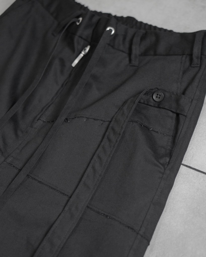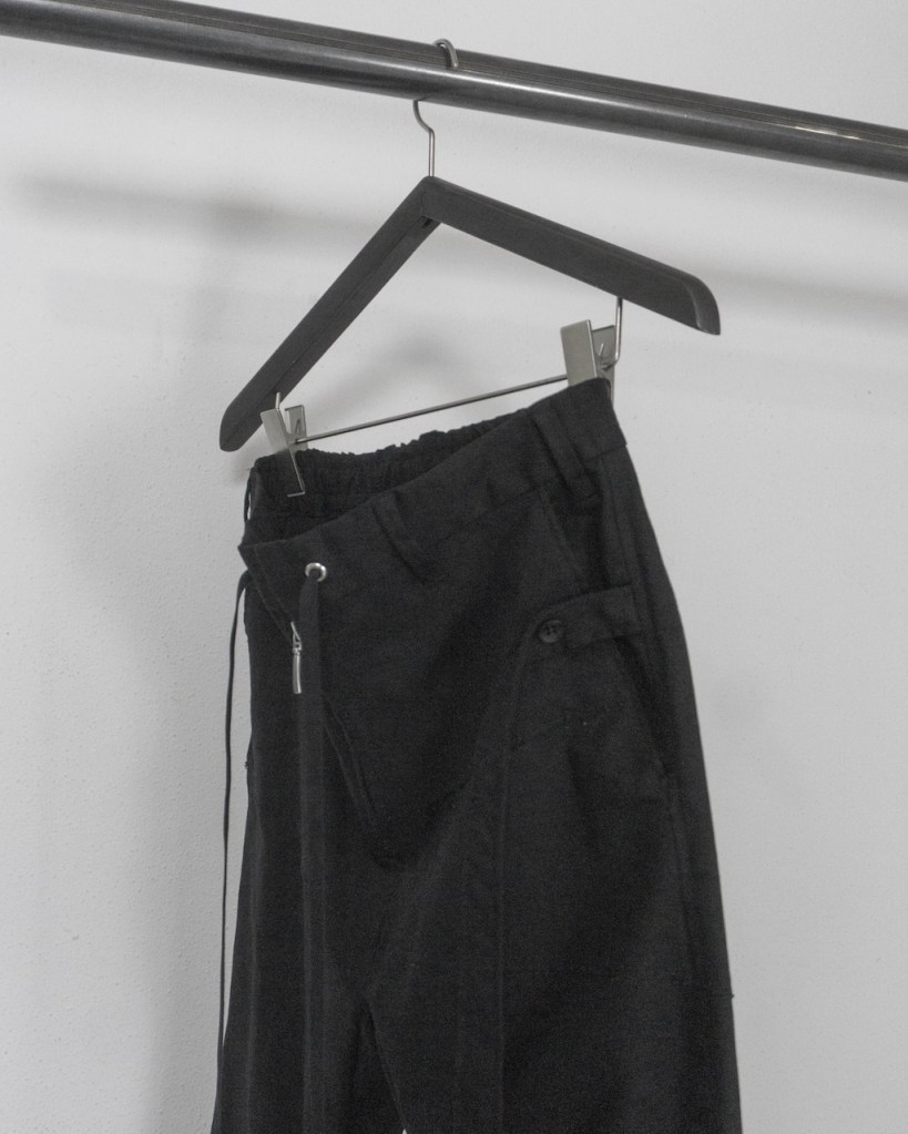 左ポケットに配したのは、従来のアーカイブで表現していたボタン&ストラップのギミック。歩みに合わせて「垂れる」という動的な要素を加えることで、無機質な構造体に呼吸をする生命感をもたらしました。