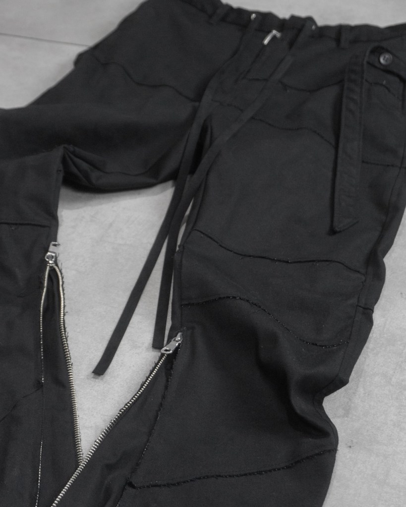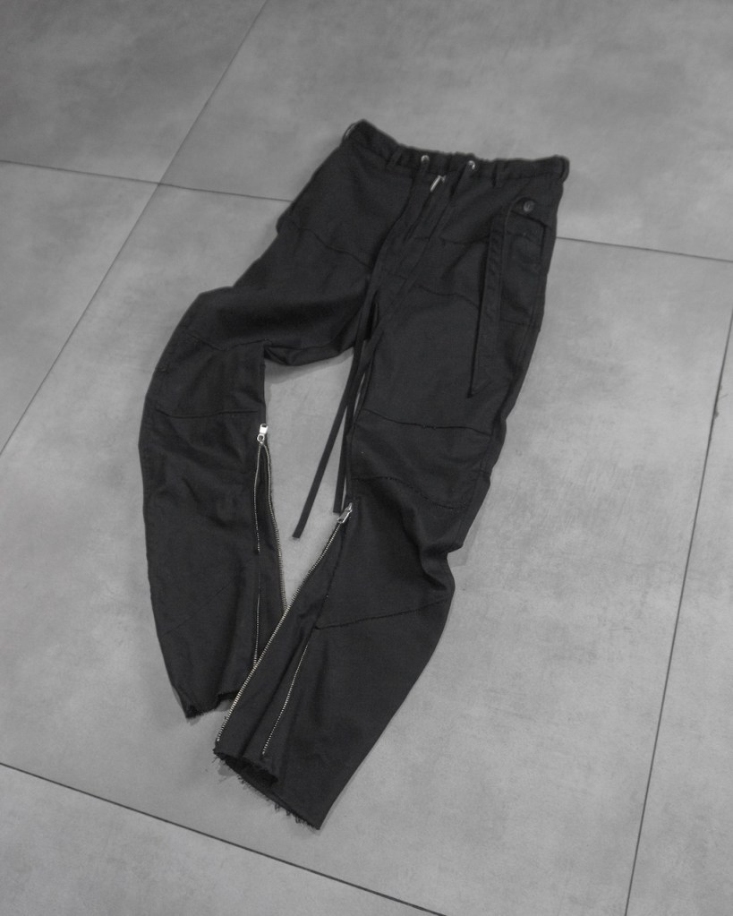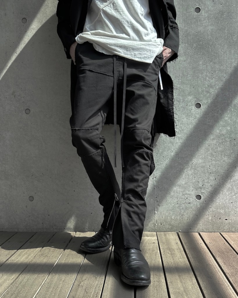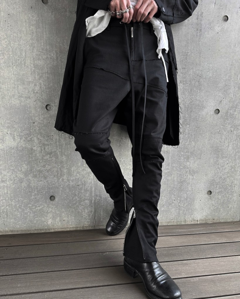 膝から裾にかけて脚を締め上げるようなキュッとしたテーパードを施している分、その対価として裾のサイドジップは極めて長く設定しました。これは単なる着脱の利便性を超え、肌へと馴染ませるための余白として機能します。