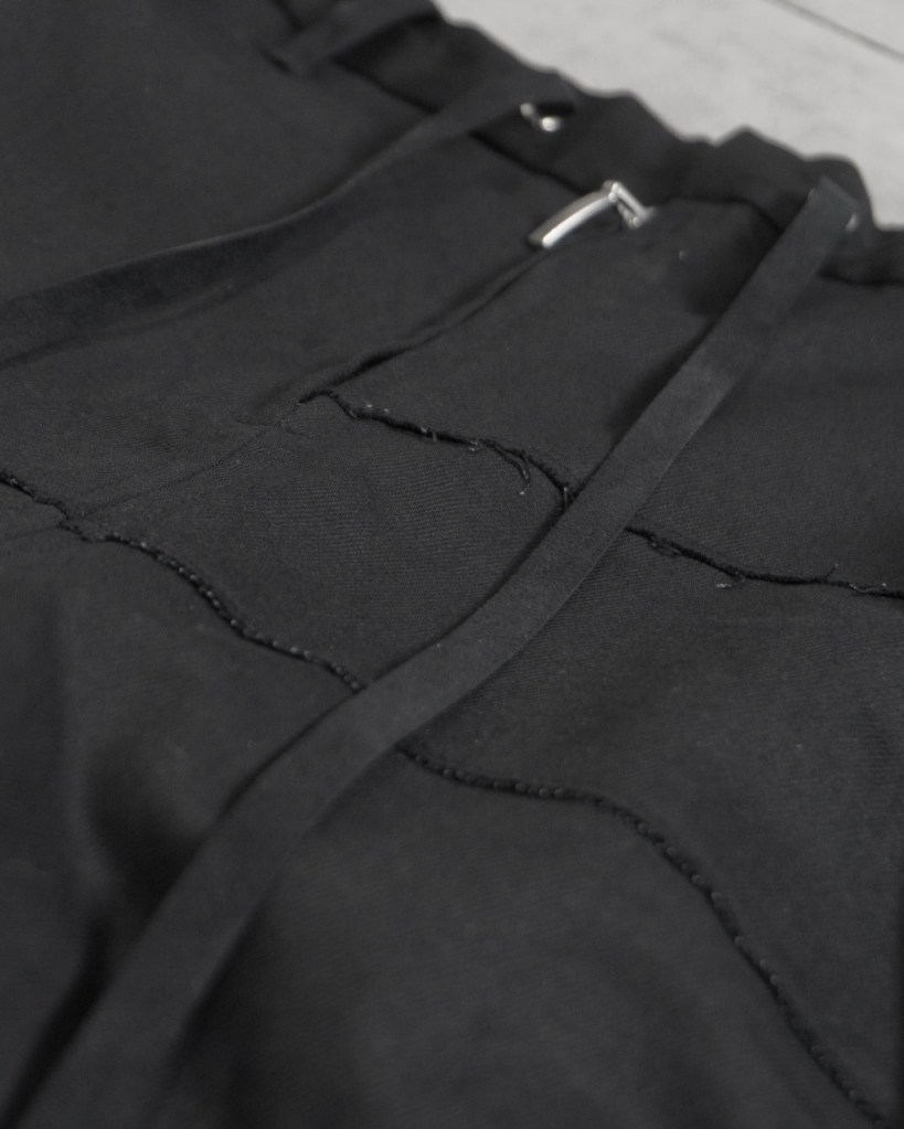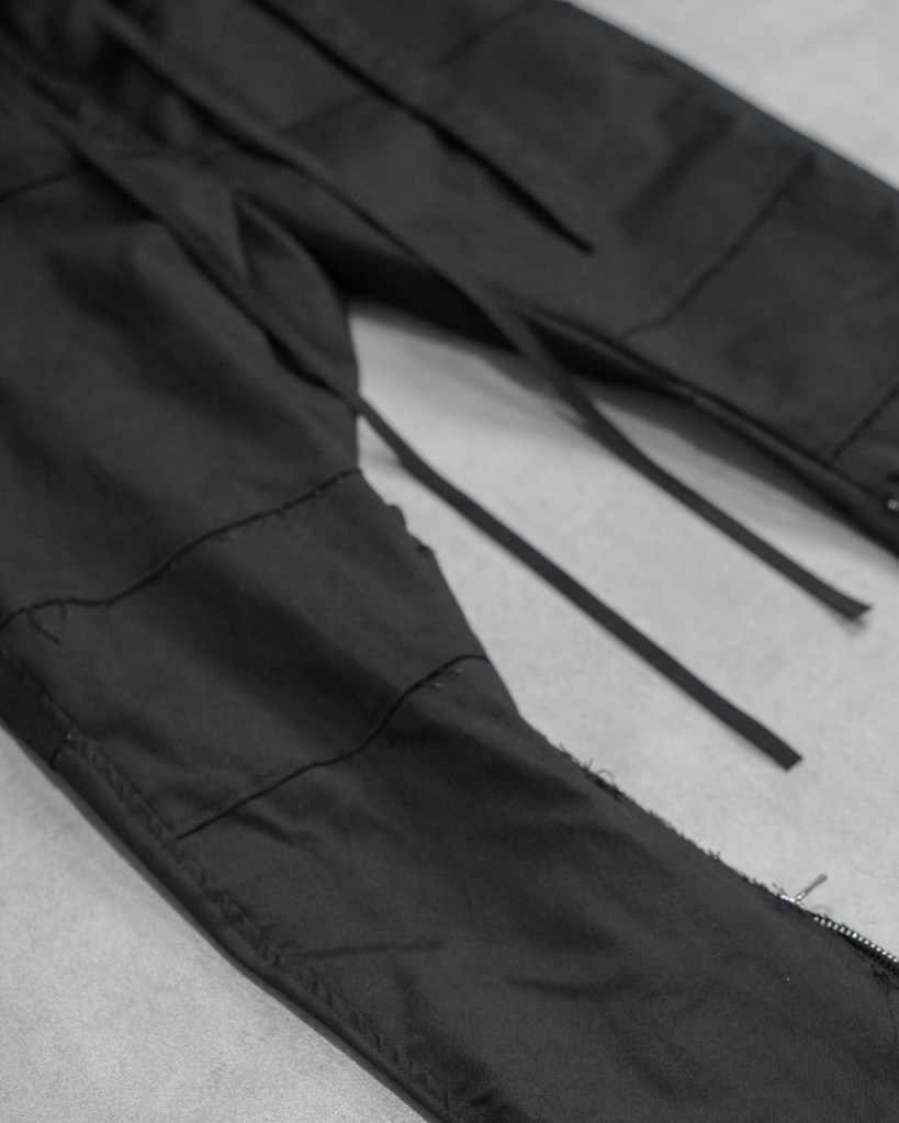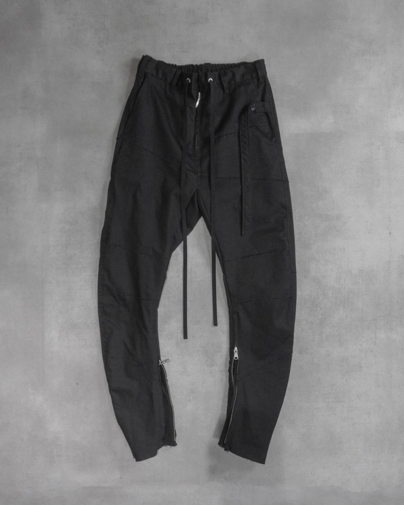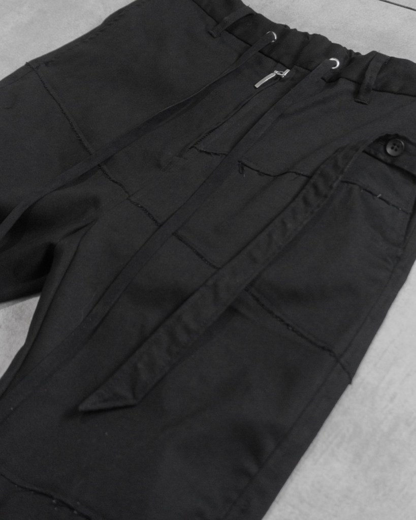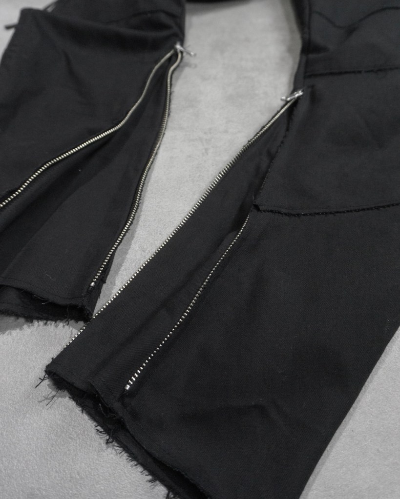 膝から裾にかけて脚を締め上げるようなキュッとしたテーパードを施している分、その対価として裾のサイドジップは極めて長く設定しました。これは単なる着脱の利便性を超え、肌へと馴染ませるための余白として機能します。