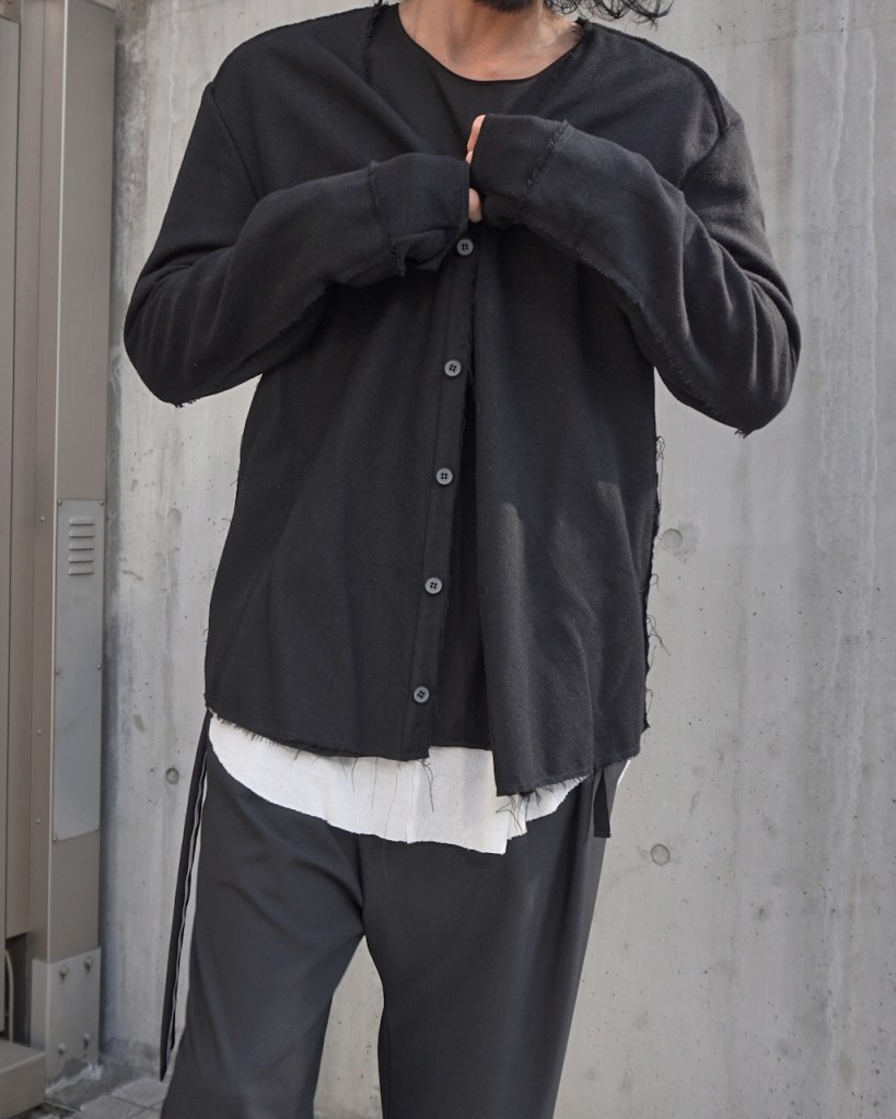 つまり内側はカーディガンのような着心地であるとともに、外面はジャケット見えしている大変都合の良い作品。