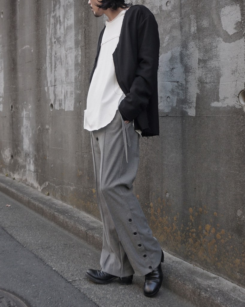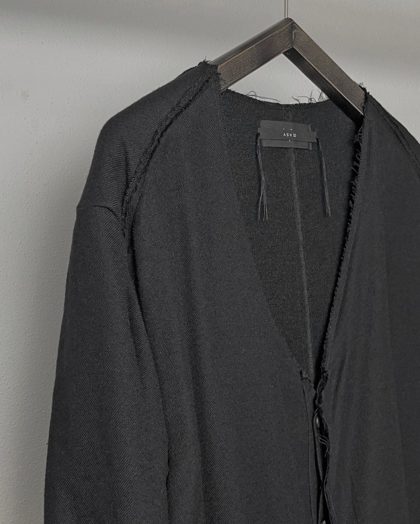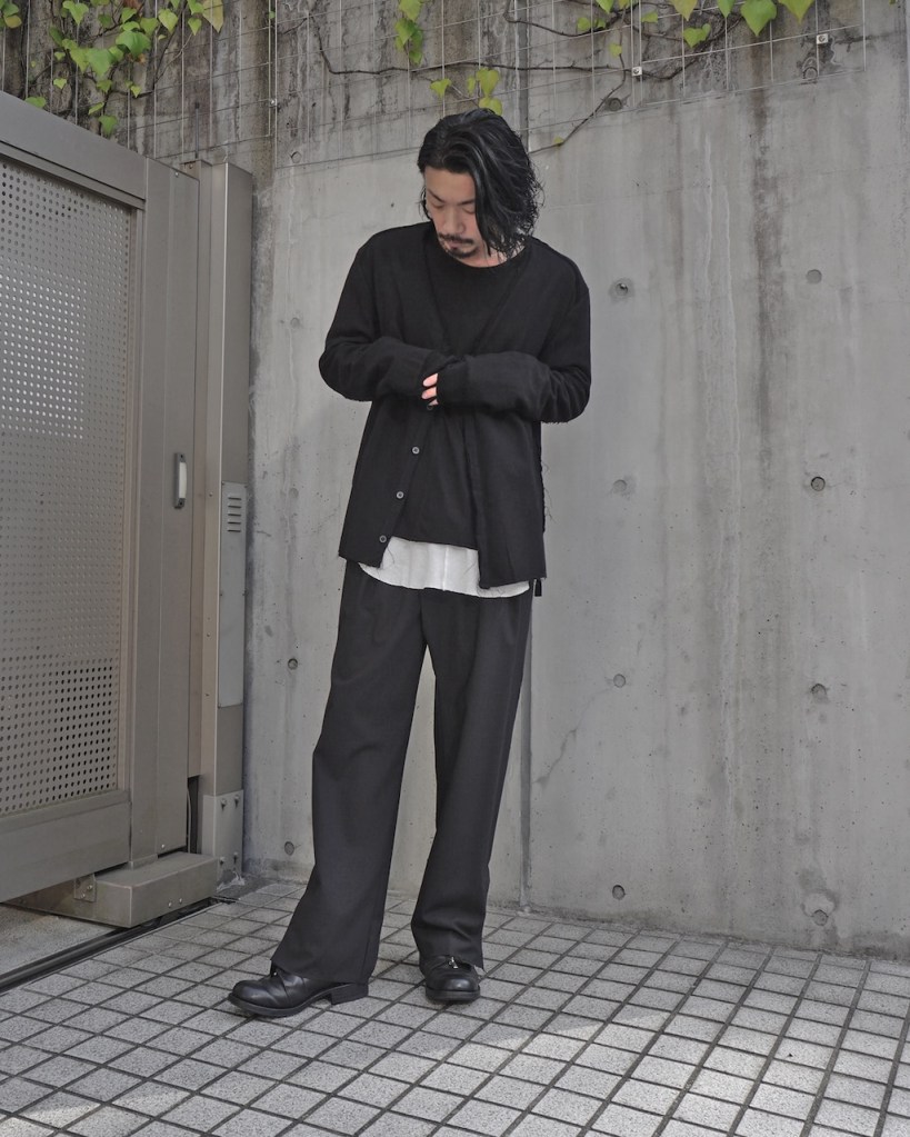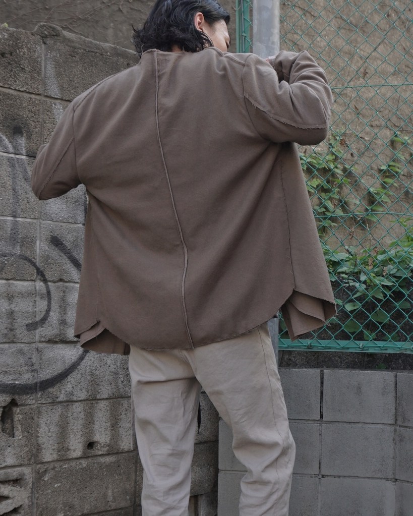 表と裏の生地の切り替えによってカーデ×ジャケットに仕立てたというわけですね。