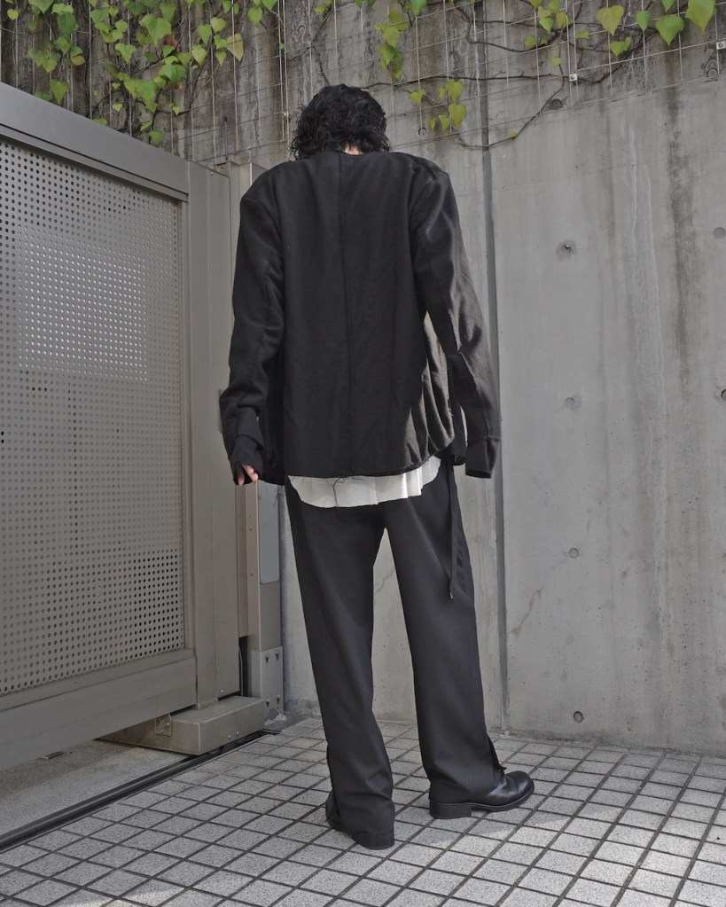 ニットカーデは毛玉になりやすいしラフすぎる。ジャケットは逆にカチッとする。ライダースタイプもいいけどジップでアンニュイさがない。──論理的に導き出した作品。