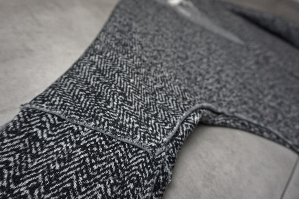 秋口に最適な厚みでスタイルを選ばない柄とフォルム。ぱっと見はニットなんですが、こう見えてジャージ素材。ツイードプリントを施してますが、フェード感あるのでチープな印象は皆無。